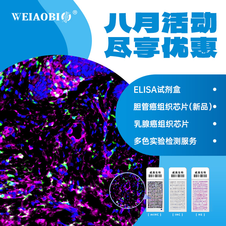 組織芯片、ELISA KIT、鏈霉親和素磁珠、蛋白純化試劑盒(磁珠法)、western整套產品(5種顏色的SDS-PAGE凝膠試劑盒、上層膠染料(遷移/不遷移)、快速轉膜液、快速封閉液、通用抗體稀釋液、免脫色考馬斯亮藍染色液等)、免疫組化整套試劑(TSA試劑盒、IHC試劑盒、SABC試劑盒、HRP多聚體二抗等)以及常用緩沖液。